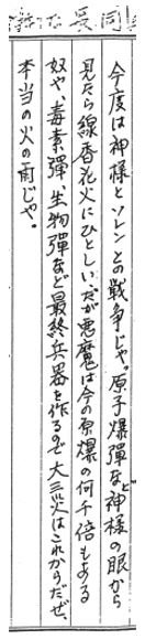 Next will come the Kami's war with the Soviet Union. In the eyes of the Kami, atomic bombs are nothing more than sparklers. But devils will create bombs thousands of times more powerful than the current atomic bombs, poison bombs, biological bombs, and other ultimate weapons. The three great calamities, i.e. fire, water and wind disasters, will unfold in the future. That is when a true rain of fire will fall.