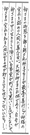 It is humanity's best conduct to hold morning and evening services to give thanks to the blessings of the Kami. A good human would accept His actual presence. No one would feel inclined to commit wrongdoing if they awakened to the fact that heaven and earth are the body of the Kami, and that people are allowed to live inside Him.