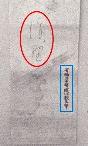 A close examination of the tanzaku's back side reveals Prince Taruhito's message (red circle) dissuading Yone from bringing their love child to the Imperial Court for fear of being killed. The blue rectangle shows probably Onisaburo's handwriting later added to the tanzaku. It seems that he intentionally misspelled Prince Taruhito's name and wrote it somewhat illegibly to hide the authenticity of the prince's tanzaku if it is confiscated by the authorities.