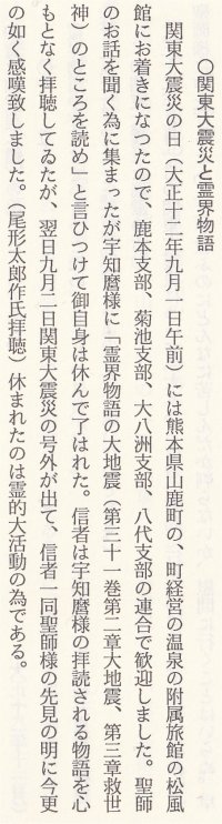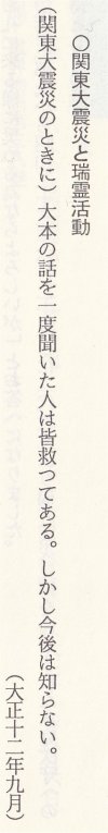 On the following day, i.e. September 2, the news of the devastating temblor shocked the believers at the hot spring resort in Yamaga, Kumamoto, mystifying them about the coincidence between Onisaburo's selected Monogatari quotes and the outbreak of the Greater Tokyo earthquake. (See below)