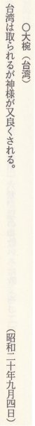 For this reason, Onisaburo prohesied shortly after the end of World War II in September, Showa 20 (1945) that Japan would lose Taiwan, one of its territories, but that the Kami would make things better for the island again in the future, as shown below: