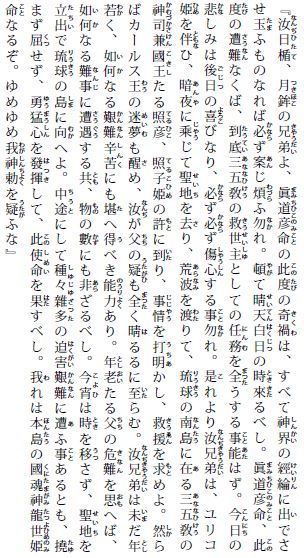 Mamichi-hiko no Mikoto's true confessions in Chapters 17 and 18 are extremely important in that they are associated with Onisaburo's lack of political ambitions and his intention to reform the Empire of Japan according to the will of the Great Kami. In other words, Onisaburo acted as a model of Mamichi-hiko no Mikoto before and during World War II, especially when he was arrested and imprisoned on a charge of lese-majeste in the Second Omoto Incident of Showa 10 (1935).