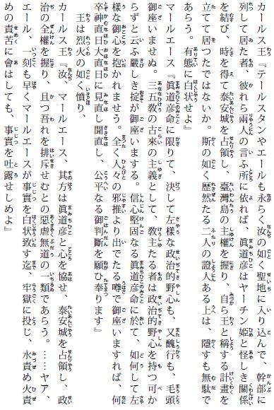 King Kahrusu acknowledges his misunderstanding of Mamichi-hiko no Mikoto, apologizes to him, and even goes so far as to offer him the throne as new king of the Takasago Island, which the appalled Mamichi-hiko no Mikoto declines politely, as shown below: