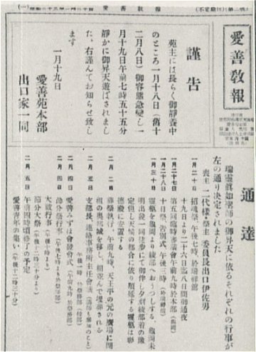 On January 19 at 7:55 a.m., Onisaburo ascended to heaven as head of the Aizen-en. He was 76 years, 5 months and 9 days old.