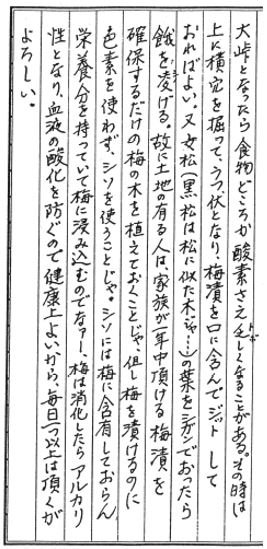 So those of you who own land should plant enough plum trees to allow your family members to secure pickled plums all year around. When you pickle plums, you should use shiso beefsteak plants (Perilla frutescens var. crispa) instead of food colors. Shiso leaves contain nutrients that plums do not have, and when they are pickled with plums, those nutrients soak into the fruit. Pickled plums turn alkaline once they are digested. They are good for your health because they prevent blood oxidation. You are encouraged to take at least one every day.