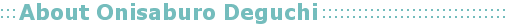 He is generally known as chairman of Omoto ("Great Origin" or "Original Root"), a religious organization founded by himself and his mother-in-law, Nao Deguchi (1836-1918). The spiritual giant did his utmost to spread the true teachings of the Great Original Deity of the universe (Creator). However, his passion incurred two persecutions (in 1921 and 1935) by the authories as they saw Omoto as incompatible with their aim to build a centralized state by deifying the Imperial Family.