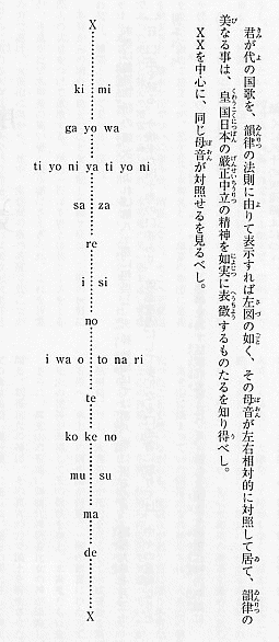 The left diagram shows a schematic arrangement of vowels in the national anthem of Kimigayo. These vowels are symmetrical along the X - X' line, with their prosodic beauty bearing eloquent witness to the spirit of strict neutrality upheld by Japan under divine protection.