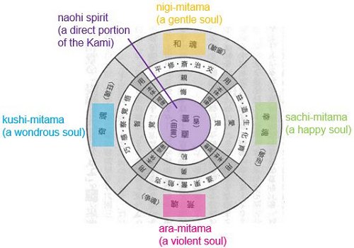 As the Creator of the whole universe, the Tenso (Progenitor of Heaven) has distributed a direct portion of Himself called naohi (direct spirit) to individual humans. This naohi is surrounded by four different souls of ara-mitama (a violent or coercive soul), nigi-mitama (a gentle and pacifying soul), sachi-mitama (a soul that brings happiness or blessings), and kushi-mitama (a soul that causes mysterious transformations), as shown below: