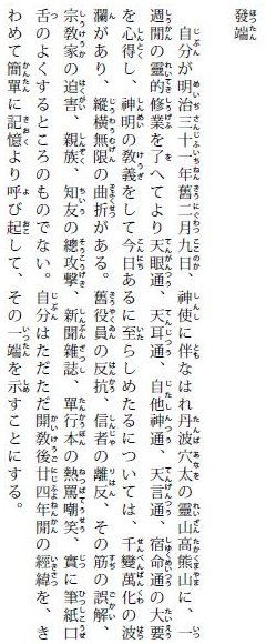 The above is an excerpt from Volume 1 of the Monogatari. It says that Omoto was founded on February 9, Meiji 31 (1898), when Onisaburo had a weeklong initiatory experience on Mount Takakuma.
