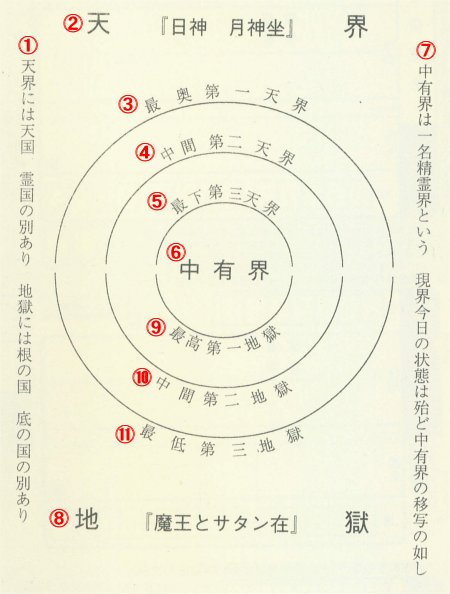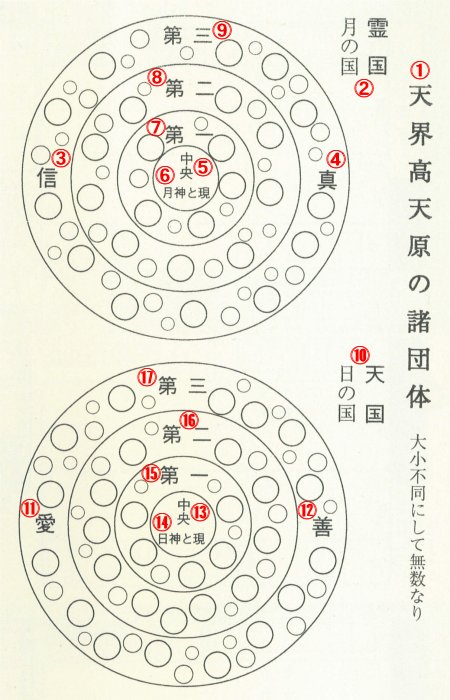 Also, Vol. 4 (The Shinji no Uchu) says Kunikototachi is the creator of the spirit world of a small cosmos including heavenly bodies in our solar system. 5.67 billion such small cosmoses constitute the Greater Cosmos ruled by Tenso (The Universe-Eternally-Standing-Deity). (The number 5.67 billion would be better off taken figuratively.)