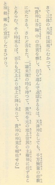 | Divine oath: | Tenso (Kamususanowo) will descend to earth to help restore the reign of Kokuso (Kunitokotachi)
