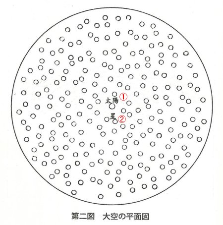 The distance between the Sun and our Earth is an eighth of the 5.67 billion ri diameter of a small cosmos. All the celestial bodies in the taiku radiate their own luminescence and are located above the Sun. The Sun's rays are never radiated toward the taiku but exclusively toward the daichi in a manner that a flashlight beams its light.