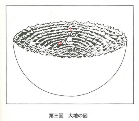 The Earth's surface is called the hoku kyoku ("north pole") of the daichi. Hoku is a Japanese kanji that has a different reading: kita ("north"). As mentioned earlier, kita also means i-ki-taru ("fire-water dripping down"), i.e. the center that receives the dripping of sui-ka ("water-fire") each from the Sun, the hub of the daichi, the peripheral icebergs on the daichi, and the Moon.