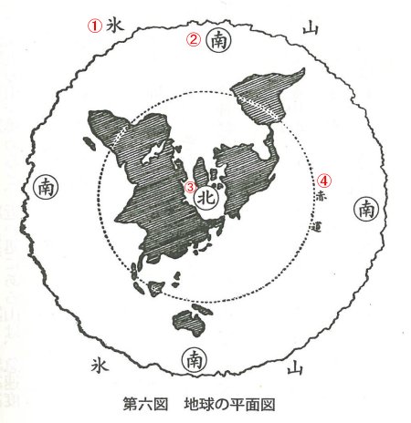 While direct rays of the Sun centre on the equator of the Earth, the centre of the daichi is its hoku kyoku ("north pole"), i.e. the Earth. Some people argue that if the Sun as the centre of the taiku is positioned to face the Earth as the centre of the daichi like two mirrors set against each other, the Central Land of Reed-Plains [7] in the north, namely Japan as the centre of the Earth, must be the equator. This is not the case, given the relationship between the tilting movements of the Sun and the Earth, which deters the Sun's rays from directly hitting Japan in the north as the centre of the Earth.