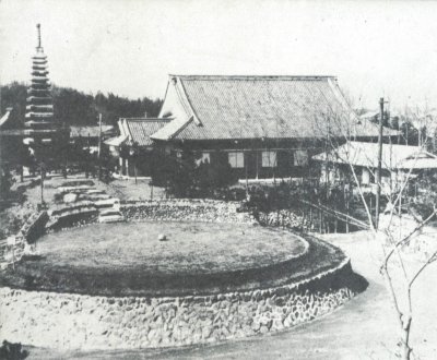 The Daisho-den Hall (back right), the Maitreya Pagoda (back left), and the Full Moon Pedestal (front) in one of Omoto's holy places called the Ten'on-kyo ("Home of Heavenly Blessing") (February, Taisho 15 [1926])