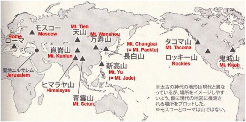 Next, Kuniharutachi no Mikoto enshrined a red jewel on Mount Wanshou (Wan Shou Shan) and had Mizuho-wake and Mizuho-hime protect it. Then, he enshrined a white jewel in Rome and had Asateru-hiko and Asateru-hime protect it. After that, he enshrined a black jewel in Moscow and had Yuhi-wake and Yuteru-hime protect it. Similarly, he enshrined a navy blue jewel on the Rocky Mountains and had Yasukuni-wake and Yaskuni-hime protect it; enshrined a gray jewel on Mout Kijoh (Mount Ogre Castle) and had Mototeru-hiko and Mototeru-hime protect it; enshrined a white jewel on Mount Changbai (Chang Bai Shan = Mount Paektu) and had Iwanaga-hiko and Tamayo-hime protect it; enshrined a crimson jewel on Mount Kunlun (Kunlun Shan) and had Oh Shima-hiko and Oh Shima-hime protect it; enshrined a yellow jewel on Mount Tien (Tien Shan) and had Taniyama-hiko and Taniyama-hime protect it; enshrined a gold jewel on Mount Seiun (Mount Blue Cloud) and had Adzuma-hiko and Adzuma-hime protect it; enshrined a silver jewel on the Himalayas and had Himalaya-hiko and Himalaya-hime protect it; and enshrined a copper jewel on Mount Tacoma (Mount Rainier) and had Kunitama-wake and Kunitama-hime eternally protect it. The deities tasked with protecting these 12 jewels were called yatsugashira (eight-head) guardians.