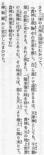 The Three Most August Deities of Heaven simply listen to the divinities' plea while They are fully aware that divine orders cannot be easily rescinded or modified once they are in place. Shortly afterwards, the Most August Deities ask Kunitokotachi to make his rule lax and flexible. For all Their attempt, the deity of absolute truth, justice and integrity will not budge an inch.